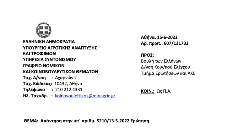 Αναλυτικά η απάντηση του υπουργού Αγροτικής Ανάπτυξης, Γιώργου Γεωργαντά αναφέρει: