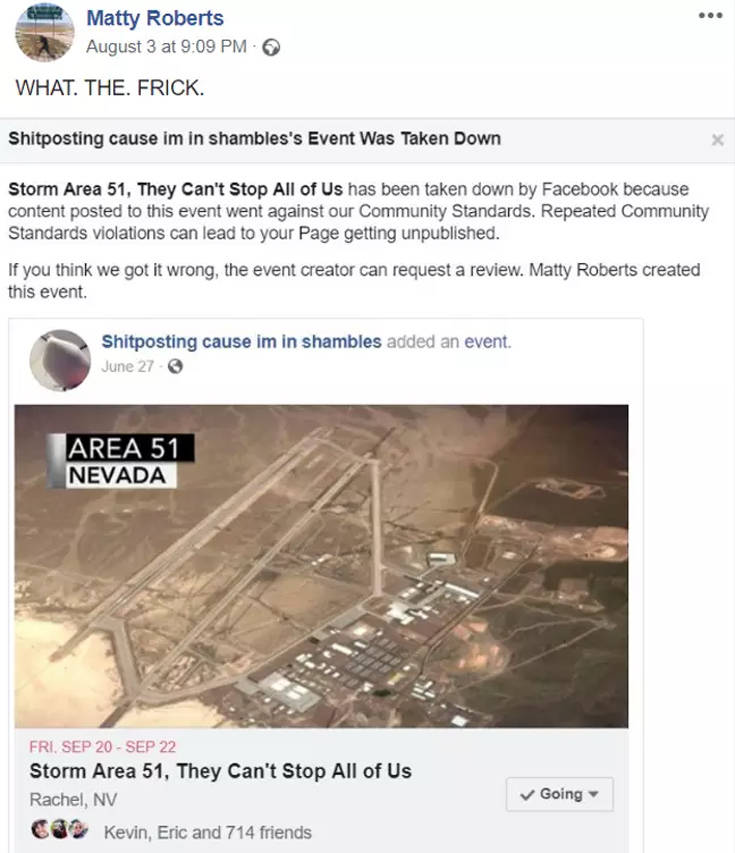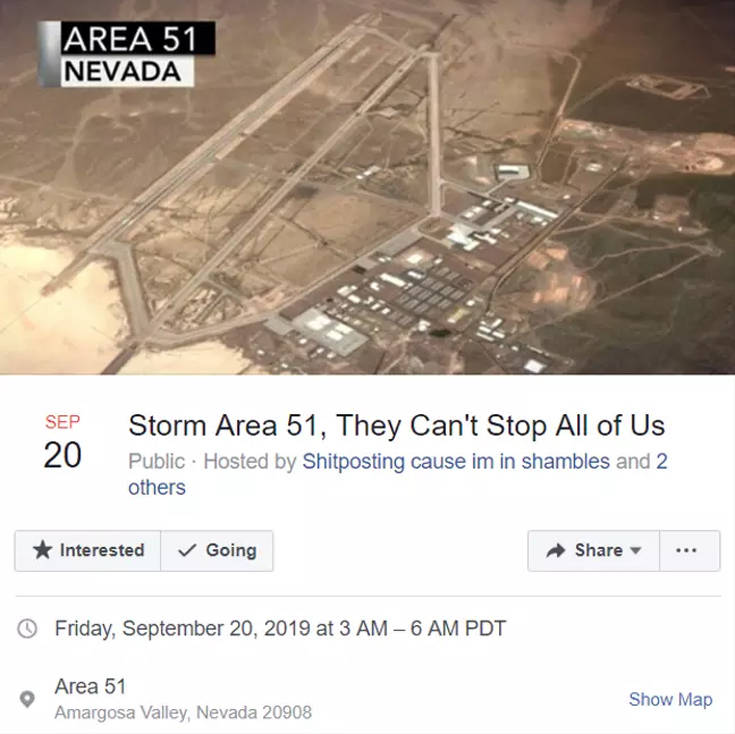 Όταν ο κόσμος που δήλωσε πως θα συμμετάσχει στην «Έφοδο στην Area 51, δεν μπορούν να μας σταματήσουν όλους» (Storm Area 51, They Can’t Stop All Of Us) ξεπέρασε τα 2 εκατομμύρια, το Facebook ανταπάντησε κλείνοντας τη σελίδα, όπως έκανε γνωστό ο εμπνευστής της Matty Roberts!