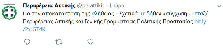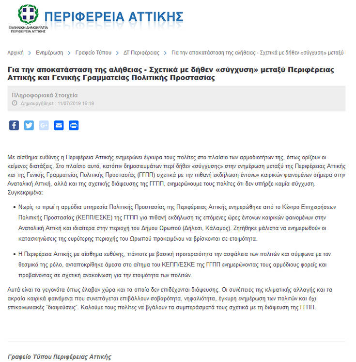 Στην ανακοίνωση η Περιφέρεια Αττικής αφήνει αιχμές για την διάψευση τονίζοντας μεταξύ άλλων: «Οι συνέπειες της κλιματικής αλλαγής και τα ακραία καιρικά φαινόμενα που συνεπάγεται επιβάλλουν σοβαρότητα, νηφαλιότητα, έγκυρη ενημέρωση των πολιτών και όχι επικοινωνιακές “διαψεύσεις”. Καλούμε τους πολίτες να βγάλουν τα συμπεράσματά τους σχετικά με τη διάψευση της ΓΓΠΠ».